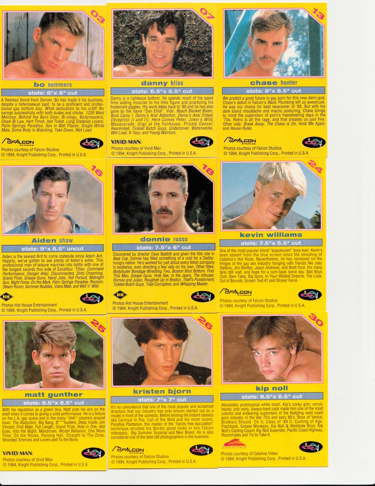 More unearthing: a set of pornstar trading cards from Falcon Studios in 1994. On one side, the faces. For each man, his face, name, and stats — this being a particularly hot and heavy neighorhood of Gayland, the stats are all about cocks and nothing else — plus a breezy writeup and some filmography. On the other side, the bodies, featuring, yes, those hard cocks. The face sides for nine pornstars are in an array below; the body sides are in a corresponding array on AZBlogX.