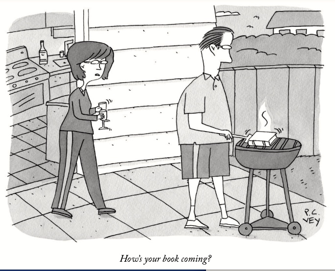 Steaks and books. The main conceit of the cartoon is the parallel between cooking a steak on the grill and writing a book: just as people ask about the progress of the steak (in a politer versions of “Is it ready yet?”), so people ask about the progress of the book — or, indeed, any writing project you might have going, but especially books, because they’re very substantial projects.