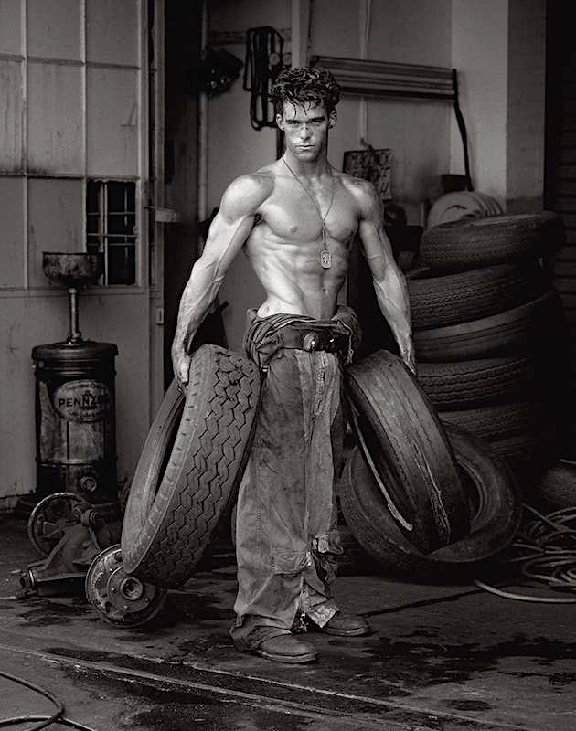 Then three carefully constructed images from the 1980s, using models rather than celebrities: “Fred with Tires, Hollywood 1984”: