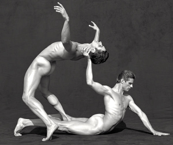 Finally, the most sculptural image in this set, with two men from the San Francisco Ballet (Pierre-François Vilanoba and Yuri Possokhov) arranged so as to make a circle with their bodies, in “Pierre and Yuri, Los Angeles 1999”: