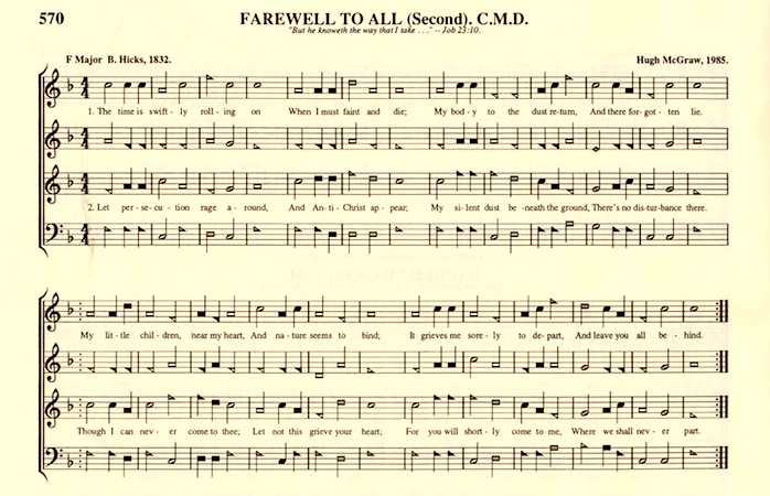 The first appearance of the text appears to be as #19t in William Walker’s Southern Harmony of 1832, with a tune by Walker (called Hicks’ Farewell) and the text attributed to the Rev. B. [Berriman] Hicks, with this note: