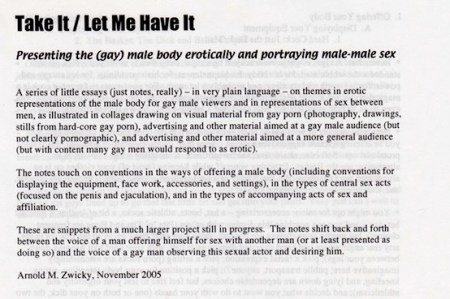 Some of my Gayland essays are in my voice; these are “academic” in tone, despite their subject and (sometimes) their language. But others (the Collage Essays) speak in another voice, that of an alter ego (call me Alex), and are keyed to two sets of images: images in “male art” (including photography, film, and video as well as painting, drawing, etc.), gay porn, ads (for mass market audiences or specifically aimed at gay men), and so on; and the collages I make from such items as raw material.