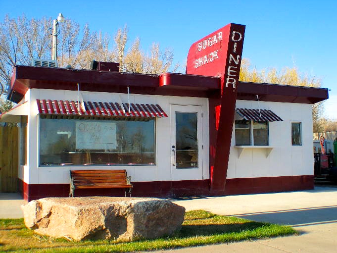 the Sugar Shack diner in Chester MT, a 10-stool diner from the Valentine Company in 1953 (“These small diners were built in Wichita [KS] for several decades from the late 1930s into the 1970s. Some are still open today.” (link)):