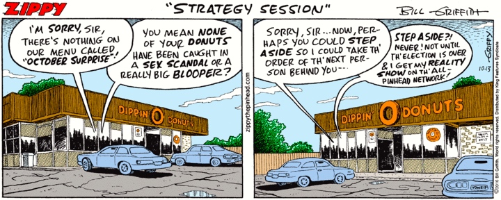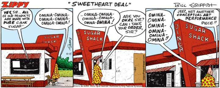 … in two recent strips, first at Dippin’ Donuts and then at the Sugar Shack. Looks like sweet tooth days for our Pinhead. Both strips are strewed with allusions of all kinds, of course.