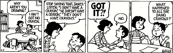 In #2, James is firmly fixed on an issue of fact, namely the lack of crayons, and simply dismisses Ruthie’s bone-headedly dinging at him about words. James has a firm sense about what’s important here. But Ruthie has been indoctrinated into the ways of school, so she can’t keep from trying to “fix” James, even when they’re talking in an informal context.