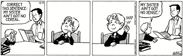 Today’s One Big Happy has Joe making a classic response to his dad’s attempt to get him to “correct” a sentence.