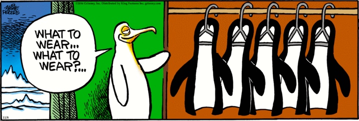 A penguin selecting a wardrobe, from five identical choices. The giggle is that the black and white appearance of the penguin is actually a suit that it puts on. From Wikipedia: