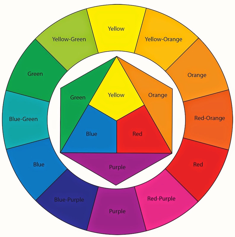 [For reference: in addition to the RYB color model, there are also RGB and CMY (C is cyan, M magenta) color models, with complementaries R and C, G and M, and B and Y; cyan is (light) blue-green on the color wheel, magenta is (light) red-purple.]
