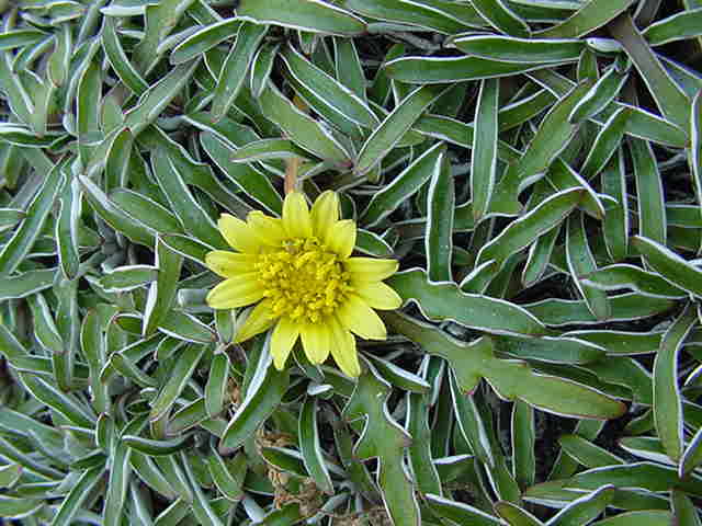 Dymondia is a genus of flowering plants in the daisy family [the composites]. There is only one known species, Dymondia margaretae [commonly called silver carpet], endemic to the Cape Province region of South Africa.
