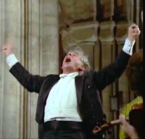 You can watch, here, a performance by Leonard Bernstein and the London Philharmonic of the last bit of the 5th movement. A still of Lenny’s berserker conducting: