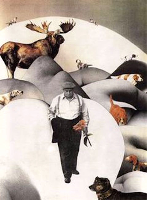 Poets and artists notoriously have muses, and poets and their muses are sometimes subjects of an artist’s work: “The Poet and His Muse” by Giorgio de Chirico, “The Poet and His Muse” by Henri Rousseau (both with female muses), and in a very different vein, “The Poet Decorates his Muse with Verse”, a playful photo montage by Duane Michals, with a male muse. Kite’s collage has a central figure that I at first took to be the artist Pablo Picasso, whose many (female) muses were his sexual partners and the subjects of a great many of his works, but that now seems likely to be the poet Pablo Neruda (see below). Women appear in the collage as stylized erotic body parts serving as the landscape the central figure is walking through. Meanwhile, his dogs are in search of the poet’s moose.