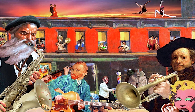 Artist Statement: My work is based on found iconographic imagery from painting, photography and popular media initially via discarded books and magazines but of late: the internet. This imagery is deconstructed, then re-composed from different sources as parody with the important blending of and interpretive tension of word (via title) and image. The technique is based on using imagery as language to build context as individual words are combined to create ideas. Uncommon juxtapositions and themes are sought to provoke thought and discussion. The less common, the merrier. A little art literacy is helpful, as many implied narratives draw on historic reactions and interpretations of various employed artists and works from their own era. Prior history with a certain painting or photograph always colors one’s interpretation. Being aware of the fact that an artist went blind or crazy or bankrupt (you know who you are) during his productive period, or that a work was once critically excoriated always adds a certain flavor. My works are narratives. The challenge is to tell a story without words: using images, colors, composition. Only the words in the title are permitted to assist, or provoke, or mislead the viewer – drawing on that part of the brain dealing with abstraction.