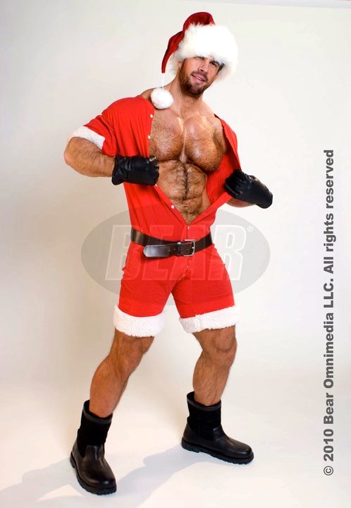 The message is in Spanish (‘happy holidays and a prosperous new year’). The main figure appears to be an oddly costumed Brobdingnagian Clone Santa (Clone as in the Castro Clone of the 1970s), complete with The Clone ‘Stache and the Cruise of Death gaze, plus a red Santa cap — and three miniature replicas of himself in various costumes (one in drag) but all with the ‘stache, plus what appears to be a shoe of some sort concealing his junk. Meanwhile, Santa is displaying his manly legs and a bit of his manly chest, while wearing what looks like a slinky patterned smoking jacket or robe (rather than the expected form-fitting t-shirt, leather jacket, or plaid shirt, worn with tight-fitting Levi’s).