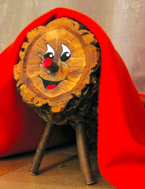 The form of the Tió de Nadal found in many Aragonese and Catalan homes during the holiday season is a hollow log about thirty centimetres long. Recently, the Tió has come to stand up on two or four stick legs with a broad smiling face painted on its higher end, enhanced by a little red sock hat (a miniature of the traditional barretina) [not in #5] and often a three-dimensional nose. Those accessories have been added only in recent times, altering the more traditional and rough natural appearance of a dead piece of wood.