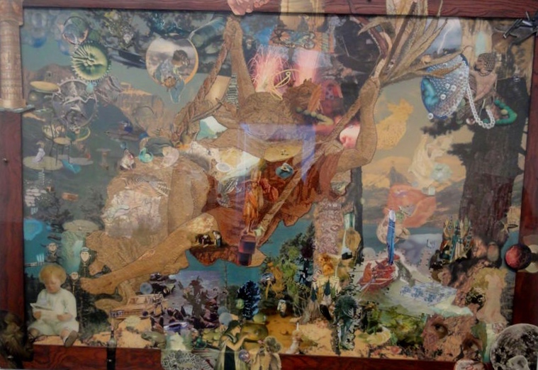 Midday Forfit: Feignting Spell II, 1971: magazine pages, jigsaw-puzzle pieces, tapestry, lithographic mural, wood, and straight pin