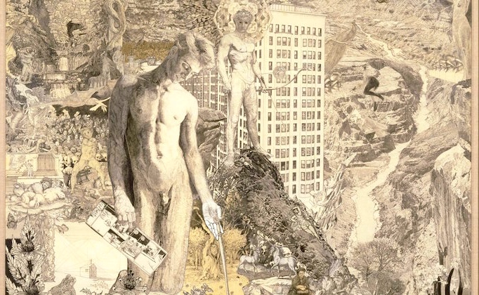 Many of Jess’s paintings and collages have themes drawn from chemistry, alchemy, the occult, and male beauty, including a series called Translations (1959–1976) which is done with heavily laid-on paint in a paint-by-number style. In 1975, the Wadsworth Atheneum Museum of Art displayed six of the “Translations” paintings in their MATRIX 2 exhibition. Collins also created elaborate collages using old book illustrations and comic strips (particularly, the strip Dick Tracy, which he used to make his own strip Tricky Cad). Jess’s final work, Narkissos, is a complex rendered 6’x5′ drawing owned by the San Francisco Museum of Modern Art.