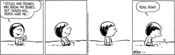 Two Calvin and Hobbes strips from a series in recent re-runs. Background: Calvin has called Susie names, deriding and insulting her. Susie tries to take solace in a proverbial rhyme, sadly without success:
