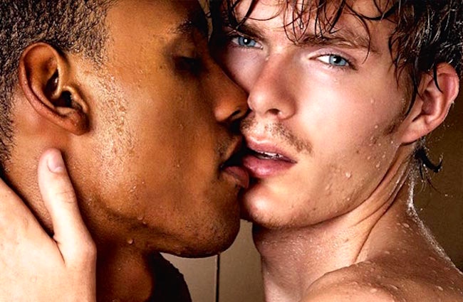 Three more kisses. The kiss in #1 (a David Vance shot of models Paul Francis and Levi Pouter) and the many other man-man kisses I’ve posted about over the years (there is now a”Men kissing” Page on this blog) are displays of affection and sexual connection, not social kisses, not merely conventional actions. Here are three more images: one more with “like attracts like” as in #1, where two similar men kiss; and then two with “opposites attract” (black man and white man kissing, older man and younger man kissing):