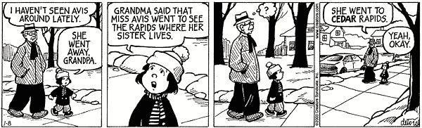 A recent One Big Happy, with Ruthie once again interpreting the unfamiliar (in this case, the place name Cedar Rapids) in terms of the familiar: