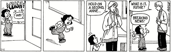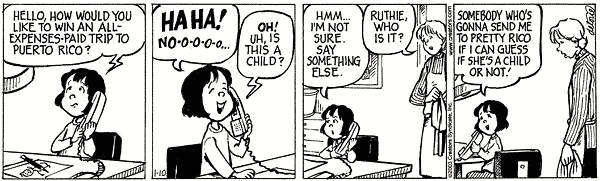 Pretty Rico and telephonic conventions. #1 is the more complex strip. The easy part is Ruthie’s misinterpretation of Puerto Rico as pretty Rico — another case where she reinterprets an unfamiliar expression in terms familiar to her. The tricky part is where the caller asks, “Is this a child?”, using demonstrative this on the telephone to refer to the recipient of the call: in the telephonic context (and not generally otherwise), “Is this a child?” conveys ‘Are you a child?’