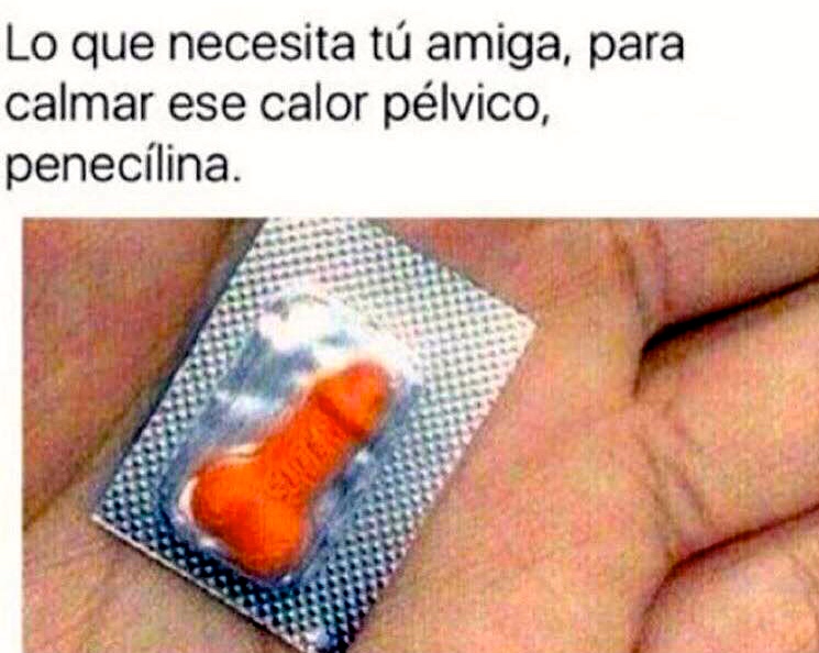 The main part of the title, up to the last word, I would translate roughly as ‘What your (female) friend needs, to calm that pelvic heat’ (calor pélvico is an entertainingly roundabout way of referring to female arousal). Now that last word might remind you of English penicillin (the drug), but the name of the drug in Spanish is penicilina, while the last word in the title is pretty clearly pene ‘penis’ plus some diminutive derivational material: what the woman needs for the fire in her genitals is a dick (and here’s a toy one). Well, that’s how I read it.
