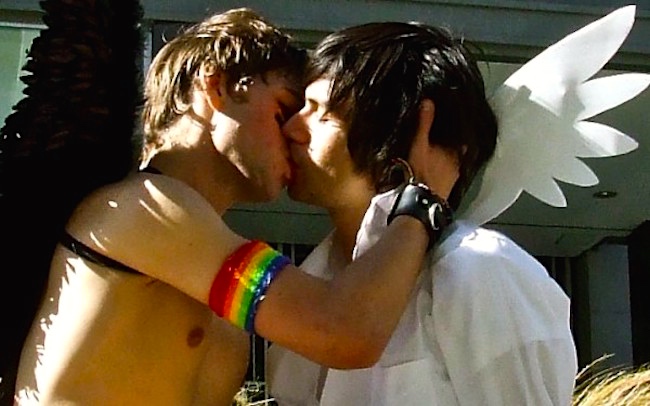 A serious lead-in to something I take great pleasure in seeing: men kissing men, women kissing women. And since tomorrow is Kissing Day…