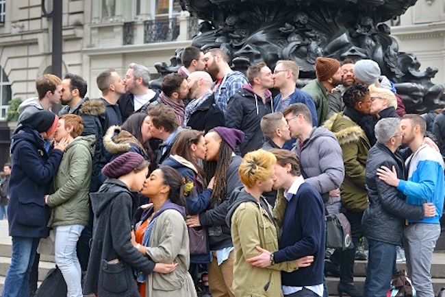 On the eve of the holiday, we come to same-sex kissing in public (in the flesh or in photos distributed publicly), which I maintain is, these days, still almost always a political act (and to my mind an admirable one) — protesting homophobia, the denial of lgbt rights, and homo-hostility of all sorts. (The exception is in kissing in the few safe spaces allowed to us, and even then photos might become truly public.) These protests can be carried out by warm and gentle strategies, like Neil Patrick Harris and his husband David Burtka performing their genuine pleasure in each other as a persistent campaign of adorable public affection, a campaign carried out on behalf of lgbt people everywhere. Or the protests can be more pointed and defiant (examples to follow), but again the protestors are acting on behalf of the community, not just themselves. Some of us in fact feel that we have a moral responsibility to act in this way, especially if we can do so without much loss to ourselves and have social capital (reputation, celebrity, authority, whatever) we can draw on: if not us, then who?