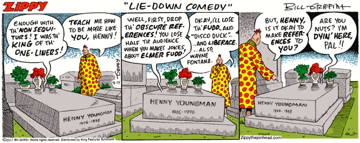 Then in sequence: Elmer Fudd, Disco Duck, Liberace, and Wayne Fontana (as is so often the case, a Zippy strip is a big grab-bag of popular culture). Plus a note on the various verbs die.