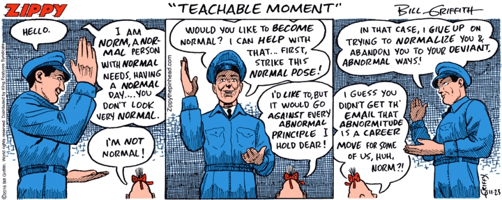 In panel 2, Norm offers to help Zippy become normal, an idea that Zippy rejects; he’s happy being a Pinhead, and if that’s abnormal, so be it. He doesn’t want to change. Then in panel 3, Norm gives up on Zippy, abandoning him to his “deviant, abnormal ways”. But Zippy is happy in his deviance, his abnormality; why would be want to become a different sort of person?