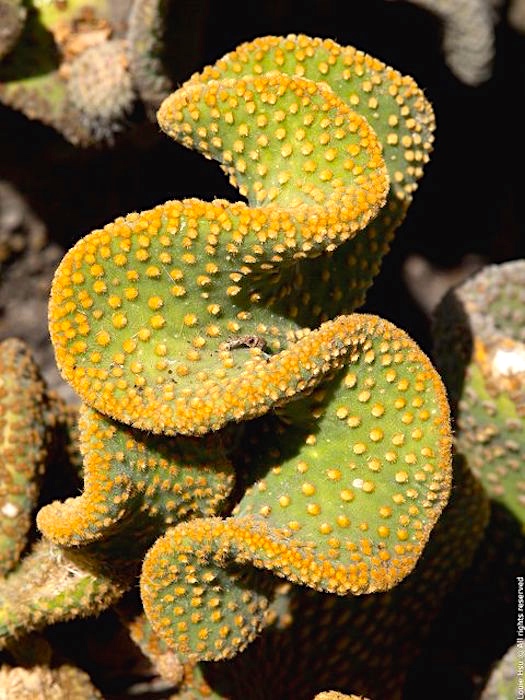 The contorted cactus. That was our initial description. Searching on that phrase netted a variety of wonderful, weird, and beautiful cactuses (which I might post about separately), but nothing close to what we’d seen. Then I tried the phrases wavy cactus and curly cactus, and found a photo that looked just right: