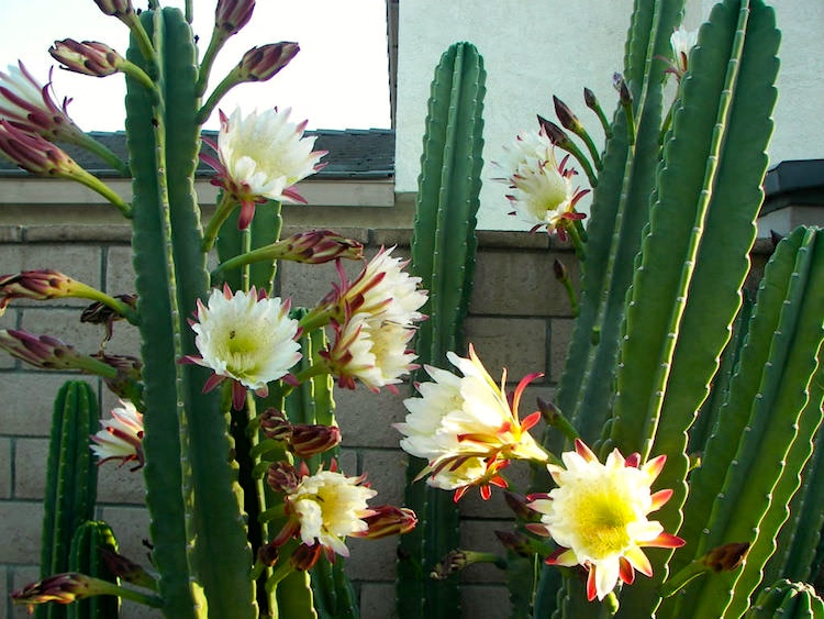 Night blooming plants. Common Cereus species are famously night blooming; this is a fairly frequent adaptation in cacti, making its blossoms available for pollination by bats, which fly at night, and by those species of moths that fly at night (especially in hot deserts, where the nights are cooler).