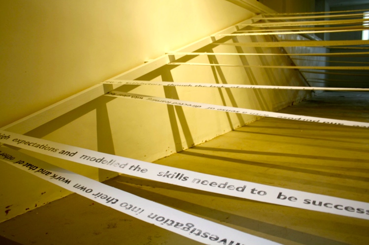 … [My] intention is to challenge the movement of the viewer, as they have to step over and duck under the areas of text. Symbolising hurdles being taken, meeting and overcoming challenges.