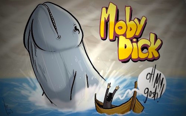 Meanwhile, there’s the sperm whale Moby-Dick of Melville’s novel. The novel was written well before dick ‘penis’ became current, but sperm whales do have huge (retractable) penises, about 2m (6.5ft) long, and whale penises do get some coverage in the book, so Moby-Dick and his penis have become subjects for cartoonists. Two items (whose sources I haven’t tracked down):