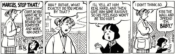 Here, Ruthie does Tough Cop, except for the panel 3 side business in her own voice, with her own opinions (the soothing raisins are a nice touch).