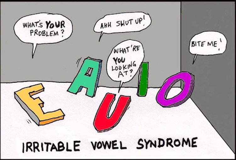 A pun on irritable bowel syndrome. The vowel letters I, A, and O are angry, throwing the letter L out of their club because he’s not a vowel. (The play on Get the hell out of here is a bonus.) Note that this is all about vowel letters, not vowels. (Depending on the dialect, speakers of English have a dozen or so distinct vowels, that is, vowel phonemes.)