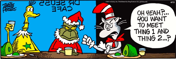 Yesterday’s Mother Goose and Grimm goes meta, with a scene in the Dr. Seuss Cafe involving Dr. Seuss cartoon characters: