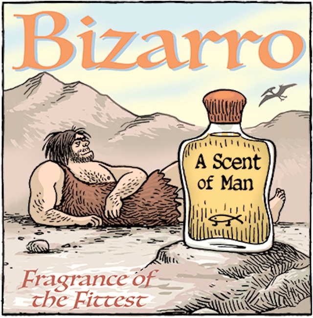 I was discussing cartoon cliches last night with someone I met at a friend’s house and he mentioned that Bob Mankoff, the cartoon editor at The New Yorker, recently put together a list of them. Without reading the list, the ones that come to my mind most readily are “crawling through a desert,” “stranded on a tiny one-tree island,” “two people in a bar,” “a psychiatrist’s couch,” and the famous “ascent of man” line of evolving mammals, like [the Bizarro in my 4/10/17 posting “A primate with a pipe”]. There are dozens more, of course.