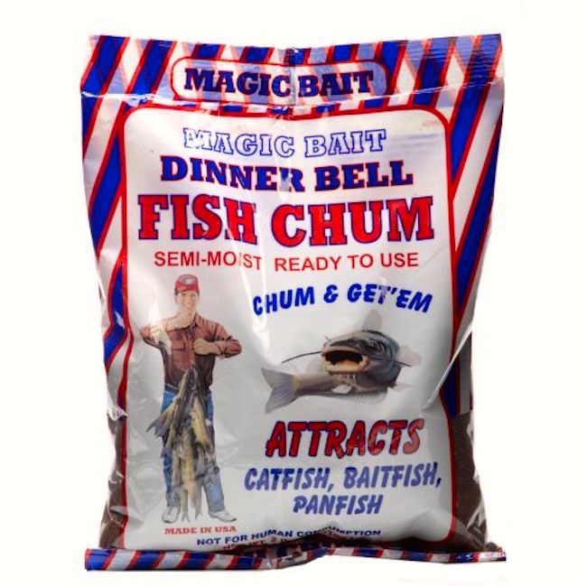 The bait noun chum. This is the noun chum 2, referring to ground-up trash fish, used as bait. In a bag:
