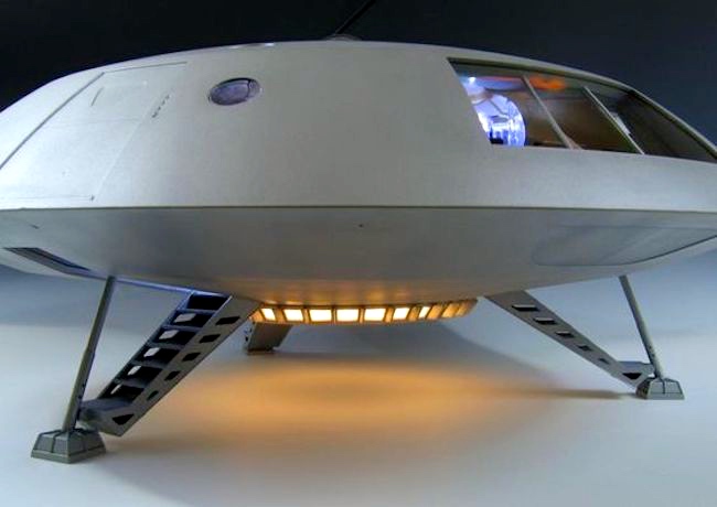 Take me to your toilets. The figures in #1 are the highly stylized Gender Twins — I think of them as Jack and Jill Gender — most commonly seen in signs identifying toilets (or restrooms, or what have you), though usable for other purposes as well. Here the twins are space aliens, arrived on earth in a highly stylized alien spaceship, a simplified version of the Jupiter 2 spaceship from the tv series (and movie) Lost in Space, shown here in a scale model: