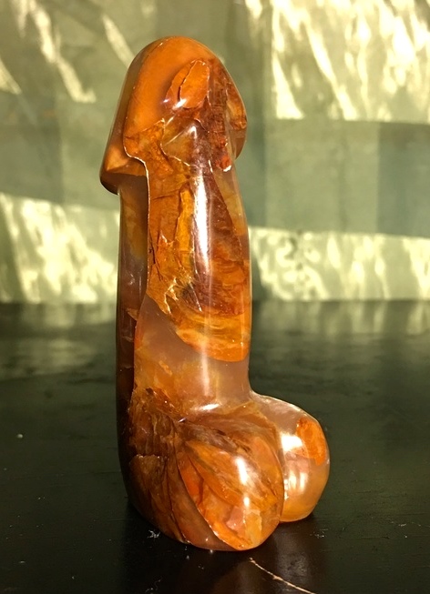 Then: /mIni fæl/ is also available as a clipping of mini-phallus, referring to miniature carvings of phalluses. These are available in many stones (quartz, citrine, emerald, sodalite, agate, lapis lazuli) and are often quite pretty. Here’s a nice one (3 inches tall) in agate: