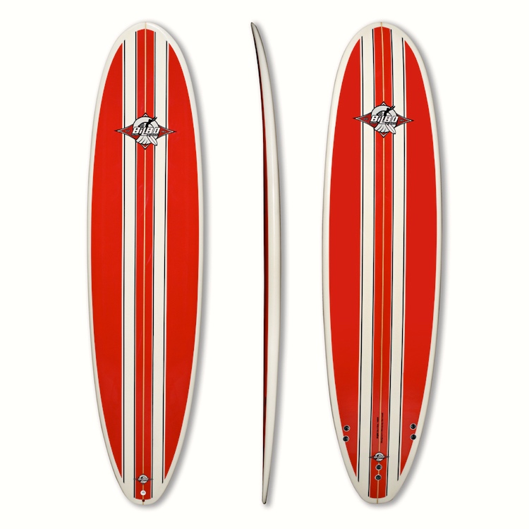 The Bilbo ‘Torpedo’ 7’6 Mini Mal Surfboard in Red (top view, side view, bottom view)