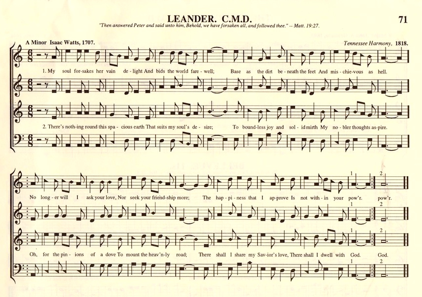 Confidence I’ve already posted on, in a 12/27/12 posting “Confidence and Bear Creek”, with the music for Confidence and links to four singings of it. Now, Leander: