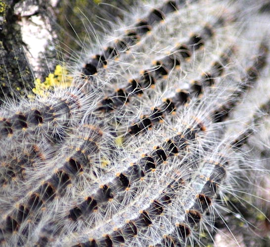 Western tussock moth caterpillars create their cocoons in the oaks where they hatch and feed. But they descend on silk threads to find another place to pupate when trees get too crowded, which is very much the case this spring. Grounds Services is taking an integrated pest-management approach by releasing microscopic worms [nematodes] and spined soldier beetles, as well as power-washing trees and surfaces where eggs are laid and cocoons are left.