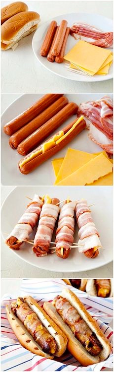 4. Hot dogs stuffed with cheese, wrapped in bacon, and grilled — a preparation Ann Burlingha write about on Facebook recently as one of the pleasures her mother provided for her girls when she was growing up (and I recalled with great pleasure as well):