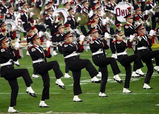 Now, Kim and I both have serious Ohio State connections, so we recognized the song as an OSU anthem, as played by TBDBITL, The Best Damn Band In The Land, aka the OSU Marching Band, which, like OSU football in general, is surrounded by a kind of frenzied irrational devotion. (When I lived in Columbus, I found this truly scary, since it led to crowds torching vehicles, smashing storefronts, and generally behaving like crazed hooligans,)