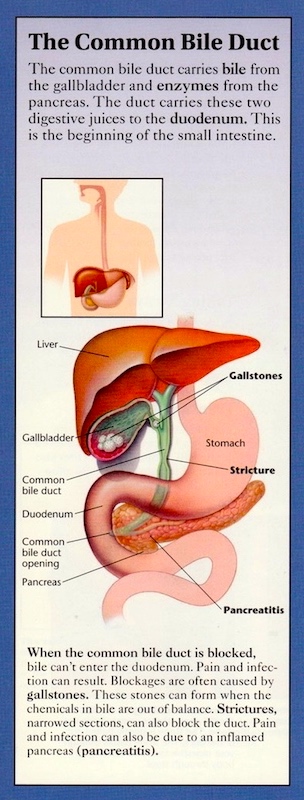 Two technical terms here: bíliàry, the adjective related to bile; and the combining form cholangio– ‘bile duct’ (cf. cholangiocarcinoma ‘bile duct cancer’), etymologically Gr. cholē ‘bile’ (cf. choleric, and, believe it or not, cholesterol) + Gr. angeion ‘vessel, receptacle’ (Latinized version in the formative angio-, as in angioplasty and angioma; also angina).