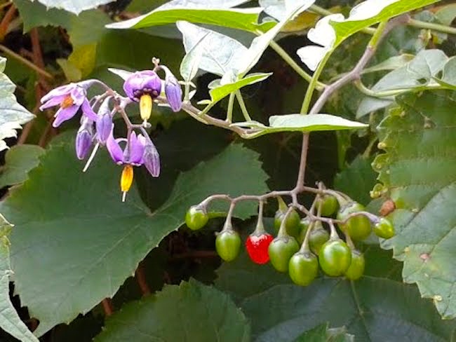 Look at the photo in #6. Again, the purple flowers. And then there are the little berries, which start out as green, turn red, and then mature to glossy black (very pretty, and extremely toxic). Those berries look much like little eggplants — which, in a sense, they are. Put the other way: eggplants are just great big, edible nightshade berries.