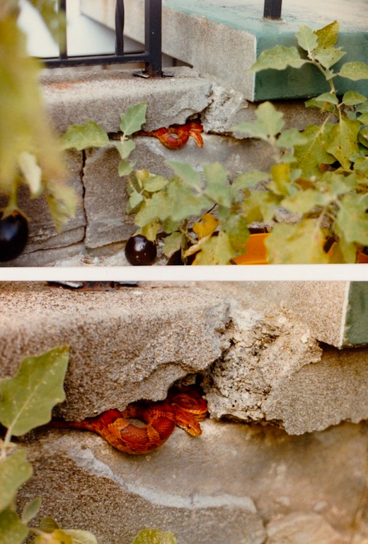The snake is curled up in a crevice in the house’s crumbling cellar wall. The corner on the upper right is the edge of the back steps. (Eventually the cellar wall was completely rebuilt, and this spot was transformed into an excellent wooden deck.)