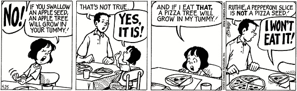 The dangers of a slice. Two things about #2: Ruthie thinks of pizzas as living things, the fruits of the pizza tree (an idea that she combines with a childish fear of swallowing seeds — a bit of childlore that, in my own experience, centered mostly on watermelon seeds, which you were never ever to swallow); and the lexical item slice (in pepperoni slice).