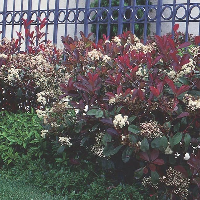 … Photinias are very popular ornamental shrubs, grown for their fruit and foliage. Numerous hybrids and cultivars are available; several of the cultivars are selected for their strikingly bright red young leaves in spring and summer. The most widely planted [include] Photinia × fraseri (P. glabra × P. serratifolia), Red Tip Photinia [there are dwarf varieties, like the Ramona parking plants]